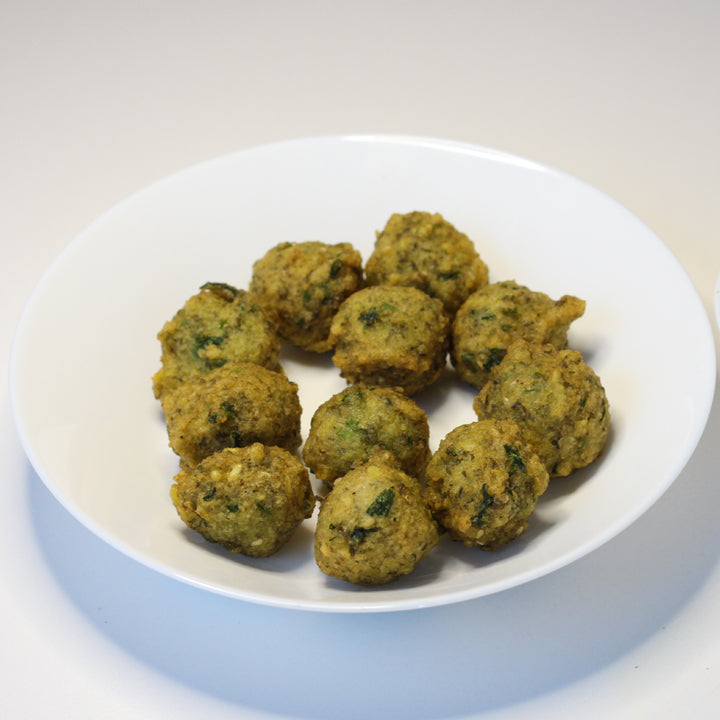 A popular gujarati snack made with moong daal (lentils). The batter is shaped into small balls, deep fried and served with onions and green chilies on the side.