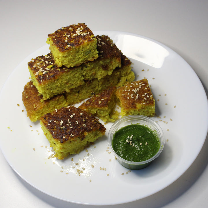 A savoury, steamed Indian lentil and rice cake, made from a fermented batter of rice, lentils, and spices, and flavoured with fresh vegetables, served with green chutney on the side.